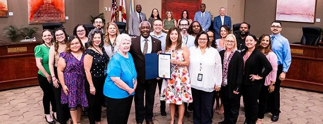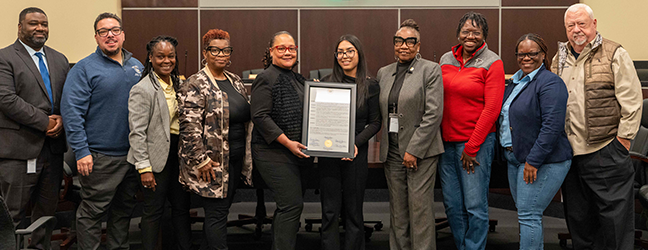 From l to r: John Wiggins, Finance Director; Hector Gutierrez, Councilman โ Ward 3; Latosha Clemons, Interim City Manager; Delores Gunn, Councilwoman โ Ward 2; Talisa Adams, Procurement Manager; Yazmin Huerta, Asst. Procurement Agent; Dr. Gwendolyn Ellison, Mayor; Kimberly James, Councilwoman โ Ward 1; Latresa Akins-Wells, Councilwoman โ Ward 4; Allan Mears, Councilman โ Ward 5